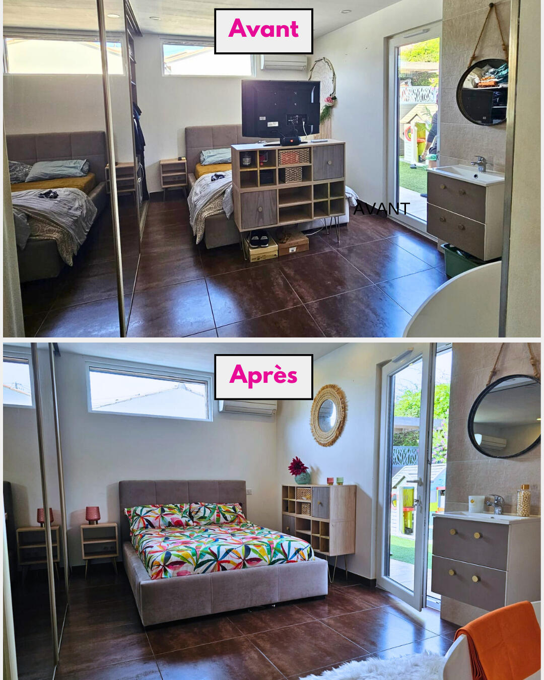 Grâce à l’ajout de nos éléments de décoration, tables de chevet, lampes, parure de lit soigneusement choisie et touches décoratives colorées, nous avons créé une chambre cosy et accueillante ✨